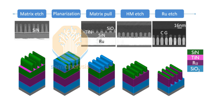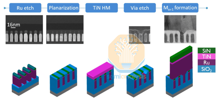 自对准:结合温和氧化和湿法清洗去除沟槽底部,形成完美的自对准通孔。随后,沉积约 15 nm 的 CVD 钌层,并进行 M2 图案化。
