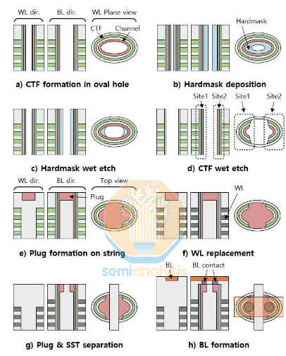 当然,这其中有个问题:这种工艺制造起来非常困难(也就是成本高昂)。蚀刻高纵横比沟道并在其中沉积多层高质量薄膜,本身就是3D NAND技术面临的关键挑战之一。这种多位点工艺需要将每个孔精确地分成两半,在中间沉积一层壁,然后以奇特的、不对称的新形状沉积传统材料。海力士已在研发环境中证明了其可行性,但目前来看,这项技术不太可能具有成本效益。