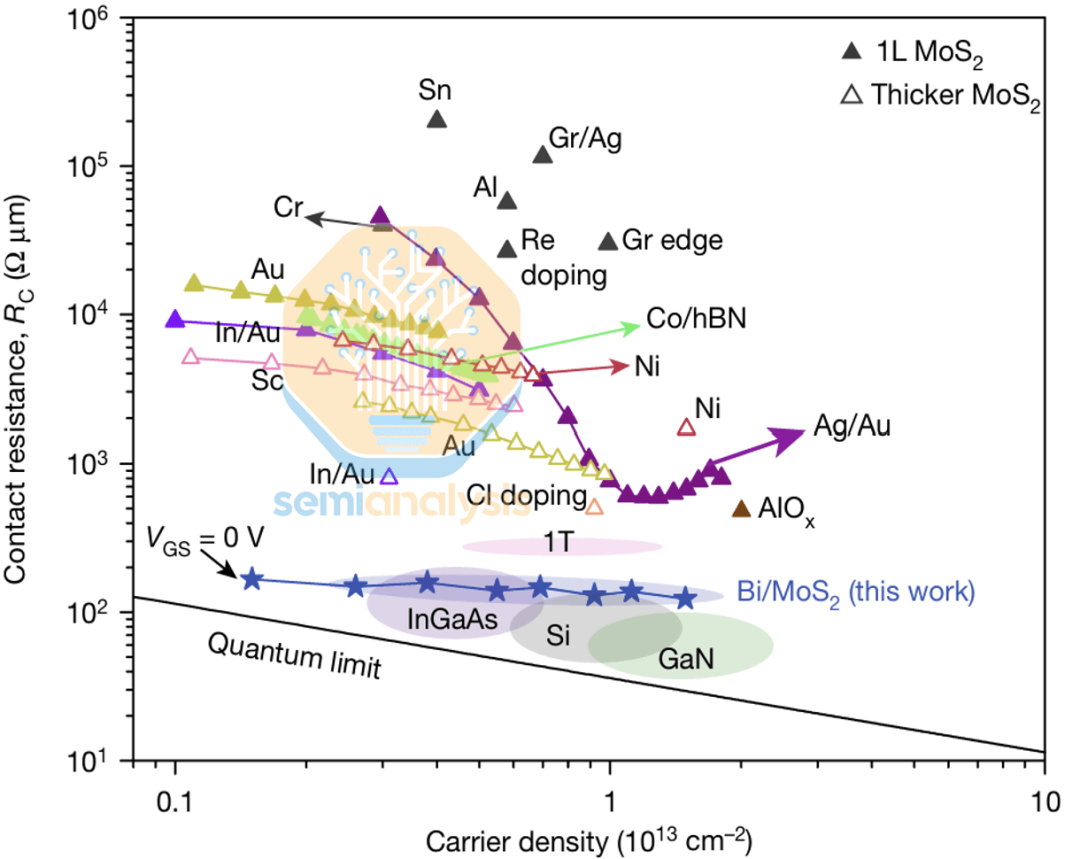 一旦接受了近期的挑战在于集成,那么下一个挑战将更加严峻:接触。为了满足工业要求,器件性能必须得到提升,而接触电阻一直是关注的焦点,因为它决定了器件是否受接触限制。大量先前的研究报告指出,在特定的接触方案下,MoS₂的 n 型接触电阻很低,但需要注意的是,这些结果通常是在高 VGS 和 VDS 电压下获得的,而这并非产品实际应用的关键偏置电压范围。相关的目标工作电压范围是低电压工作,即 |VGS| < 1 V,|VDS| < 0.1 V,接触电阻 Rc < 100 Ω·µm。这重新定义了目标:需要在低偏置电压下实现高载流子浓度,这样 Rc 才能在实际工作条件下(而不仅仅是在过驱动条件下)接近量子极限。