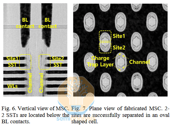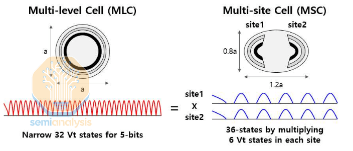 在传统架构中,每个沟道需要存储 32 个不同的阈值电压 (Vt) 值才能实现 5 位/沟道 (5bpc) 的存储。假设阈值电压范围总共为 1V,那么每个 Vt 步长仅为 1/32 伏。而在这种多站点架构中,只需从每个站点读取 6 个不同的 Vt 值,即可通过并联读取两个站点,获得 36 个不同的状态(足以满足 5bpc 的存储需求,外加一些未使用的额外状态)。此外,两个站点占用的空间与一个传统沟道大致相同,因此最终得到的是 36 个易于读取的 Vt 状态,而不是 32 个难以读取的状态。