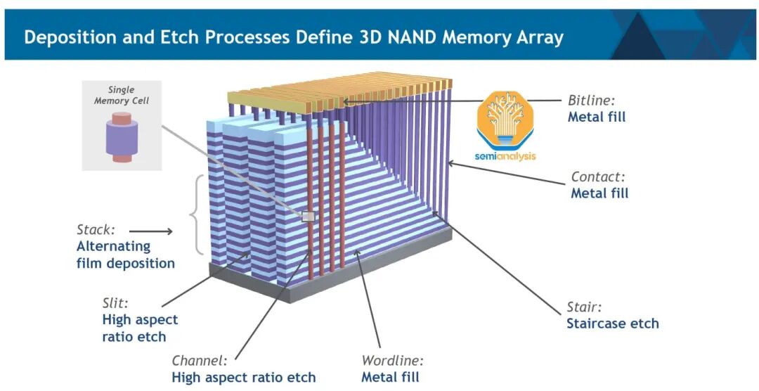 随着单层结构中层数的增加,蚀刻和其他加工步骤的难度也随之增加。海力士的极限似乎在120层左右。要蚀刻出纵横比约为1:100的笔直均匀的圆柱体,沟道蚀刻非常困难。这需要使用高纵横比蚀刻设备,目前采用的是低温蚀刻技术。Lam公司过去一直占据着这一领域的主导地位,但TEL公司正在迎头赶上。它是NAND闪存生产中最重要、也最难制造的设备之一。