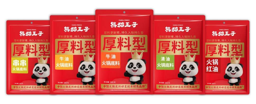 为了系统性满足这些高阶需求,熊猫王子将“厚料”作为产品创新原点,并针对性研发出了厚料型牛油火锅底料、厚料型清油火锅底料、厚料型串串火锅底料等一系列厚料型底料产品。