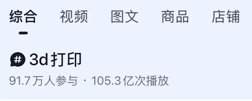 国内抖音“3d打印”词条播放量高达105.3亿次,相关话题均达数亿次曝光。