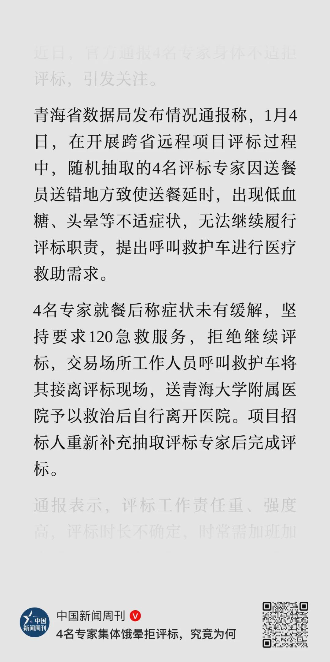 1月4日,因为送餐员送错地方延时了,随机抽取的郑XX、吴XX、刘XX、曹XX等4名评标专家在开展跨省远程项目评标过程中,出现低血糖、头晕等不适症状。