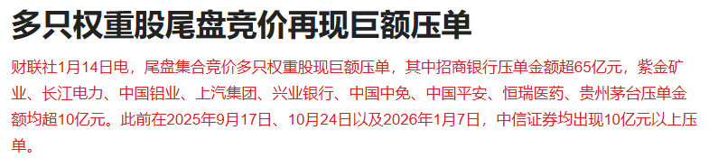 另外,尾盘集合竞价多只权重股现巨额压单,其中招商银行压单金额超65亿元,紫金矿业、长江电力、中国铝业、上汽集团、兴业银行、中国中免、中国平安、恒瑞医药、贵州茅台压单金额均超10亿元。