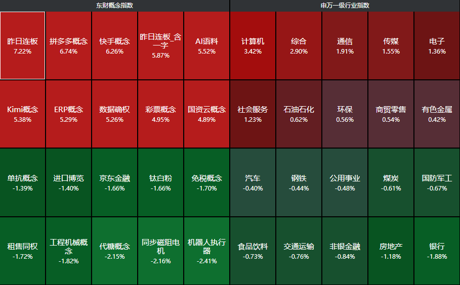 分行业来看,计算机、综合、通信、传媒、电子等行业领涨,银行、房地产、非银金融、交通运输、食品饮料等行业领跌。