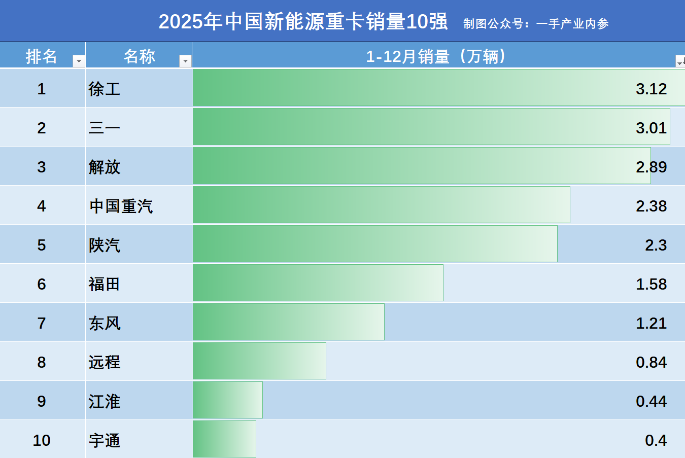 另附:2025年1-12月中国新能源重卡销量10强厂商,数据源于:北斗营运证入网销量数据。