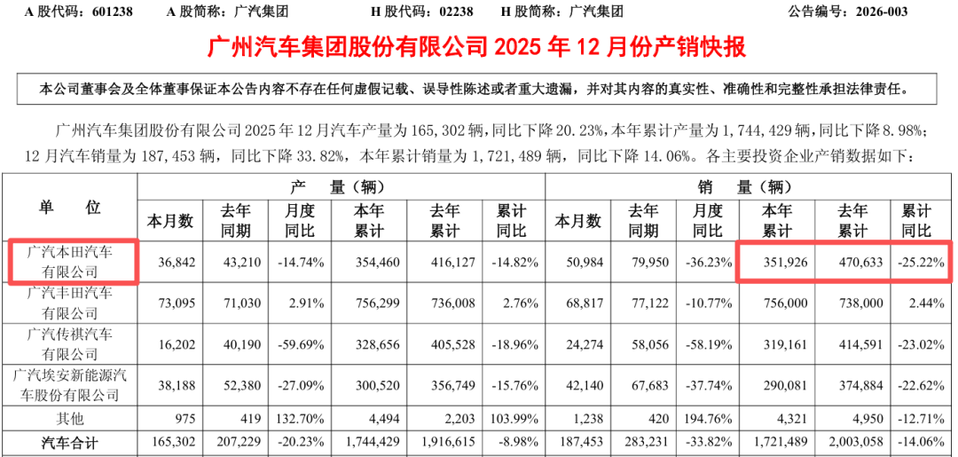 这也是继2024年销量同比大跌26%后,2025年广汽本田在华销量再度下滑24%。