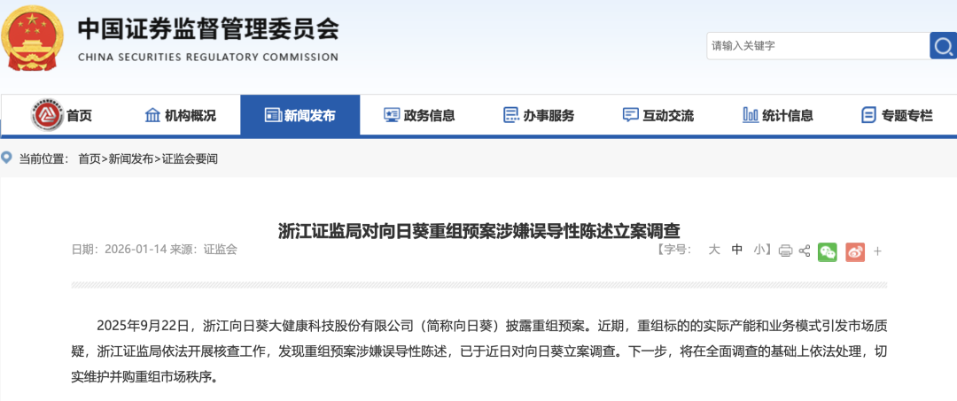 近期,重组标的的实际产能和业务模式引发市场质疑,浙江证监局依法开展核查工作,发现重组预案涉嫌误导性陈述,已于近日对向日葵立案调查。下一步,将在全面调查的基础上依法处理,切实维护并购重组市场秩序。