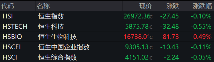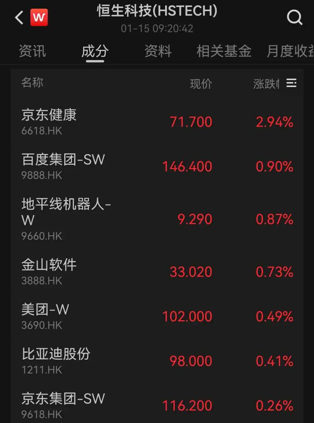 1月15日,香港恒生指数开盘跌0.10%,恒生科技指数跌0.55%。