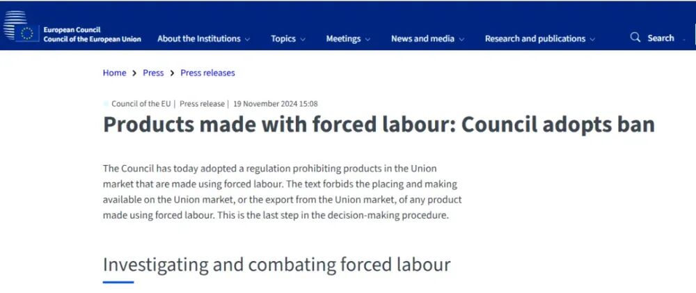 2024年11月,欧盟理事会以555票赞成、6票反对、45票弃权通过《欧盟市场禁止强迫劳动产品的条例》,并将于2027年12月全面执行。
