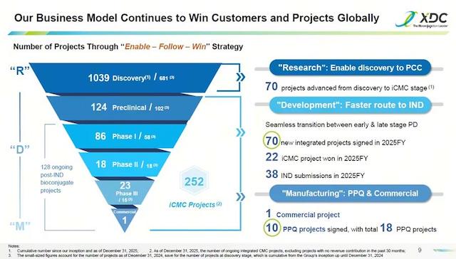 截至2025年底,药明合联累计开展1039个发现阶段项目,从临床一期到商业化生产阶段的项目共有252个。