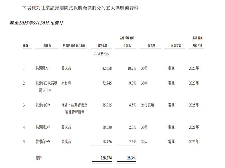 供应商集中度的波动值得注意。SKG未来健康招股书显示,其于2022年、2023年、2024年及截至2025年9月30日止九个月,于各期间向五大供应商的采购额分别占同年/期总采购额的23.0%、26.1%、14.3%及28.3%。其于各期间向最大供应商的采购额分别占同年/期总采购额的8.4%、14.9%、4.2%及10.2%。集中度提升至28.3%,单一供应商的交付波动、质量波动、价格波动可能会直接影响产能与成本,尤其在主业毛利依赖产品体验稳定的情况下。