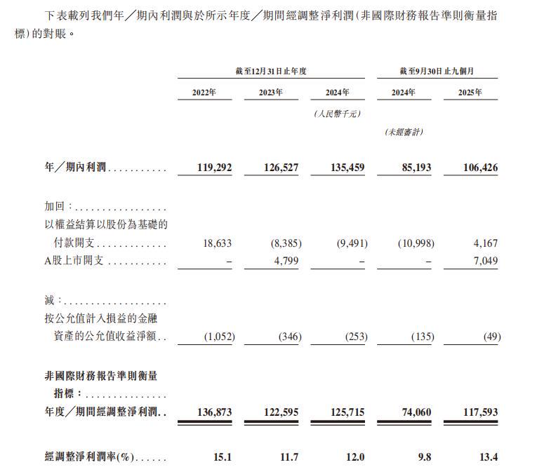 值得关注的另一问题是,SKG未来健康招股书显示,其期内利润率从2022年的13.2%下滑至2024年前九个月的11.3%,而后在2025年前九个月微升至12.1%。而“经调整”指标提供了另一种视角。招股书显示,其经调整净利润率截至2025年9月30日止九个月为13.4%,对应年度2022年为15.1%,2023年为11.7%,2024年为12.0%。