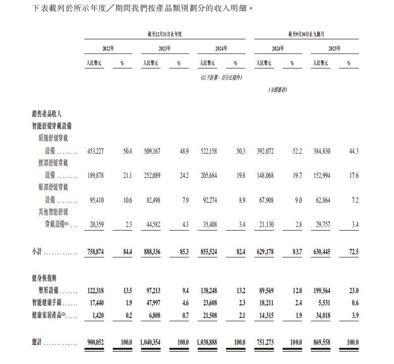 SKG未来健康新品扩张则更明显体现在健身恢复与塑形设备上,其招股书数据显示,该品类收入占比由13.5%波动至23.0%。