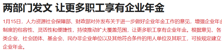 人力资源社会保障部、财政部对外发布关于进一步做好企业年金工作的意见,增强企业年金制度的包容性、灵活性和便捷性,持续推动扩大覆盖范围,让更多职工享有企业年金。根据意见,各类企业、社会团体、基金会、民办非企业单位以及其他符合条件的用人单位及其职工,可按规定建立企业年金。