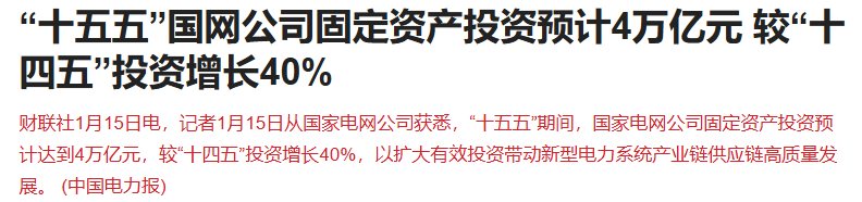 “十五五”期间,国家电网公司固定资产投资预计达到4万亿元,较“十四五”投资增长40%,以扩大有效投资带动新型电力系统产业链供应链高质量发展。