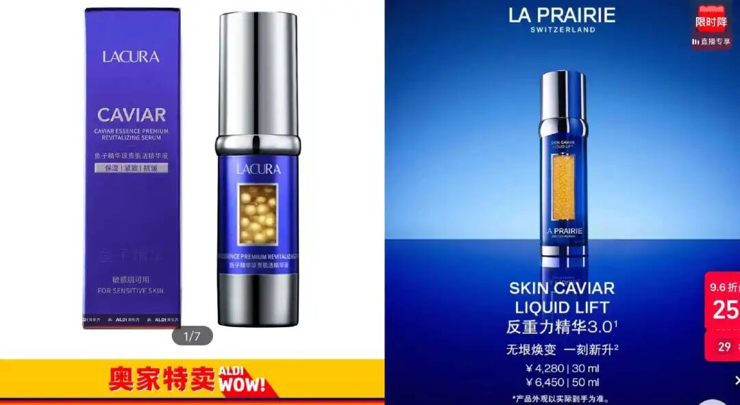 奥乐齐却拿出200块一套的鱼子护肤品,更重要的是,这实在太像贵妇品牌La Prairie的鱼子精华系列了。这些年,被叫做“抗老界爱马仕”、顶配面霜能卖到上万块的La Prairie勇闯中国,不断推出各种新产品,但当家花魁依旧是蓝瓶鱼子精华系列。