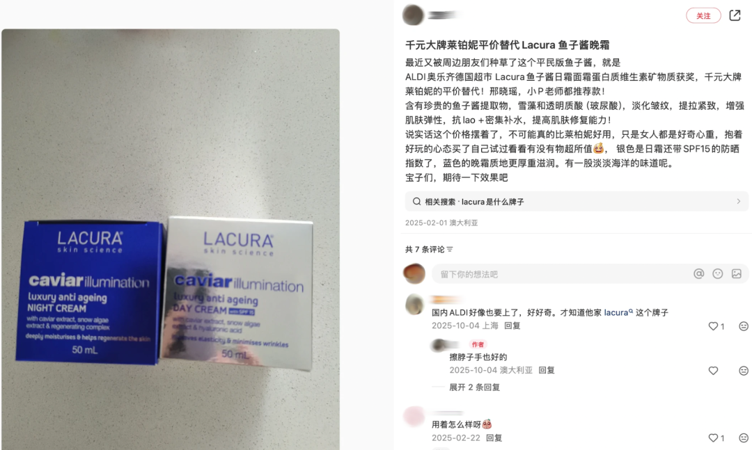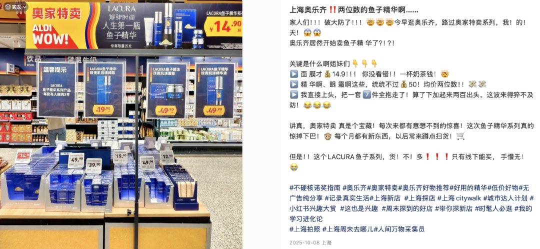 社交平台上可以看到不少博主宣传奥乐齐的鱼子精华系列如何具有性价比,在品质还不错的前提下,价格足够低。