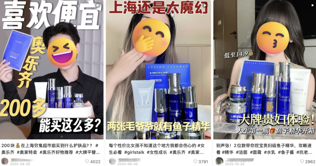 把几千块的贵妇护肤品打到14块9,一时间,社交平台上出现了无数「奥乐齐护肤必买三件套」。三件套没有统一的标准,但博主们所推产品都像极了La Prairie、La Mer、Aesop等贵价护肤品牌的孪生兄弟,而价格,全都低到你想象不到。