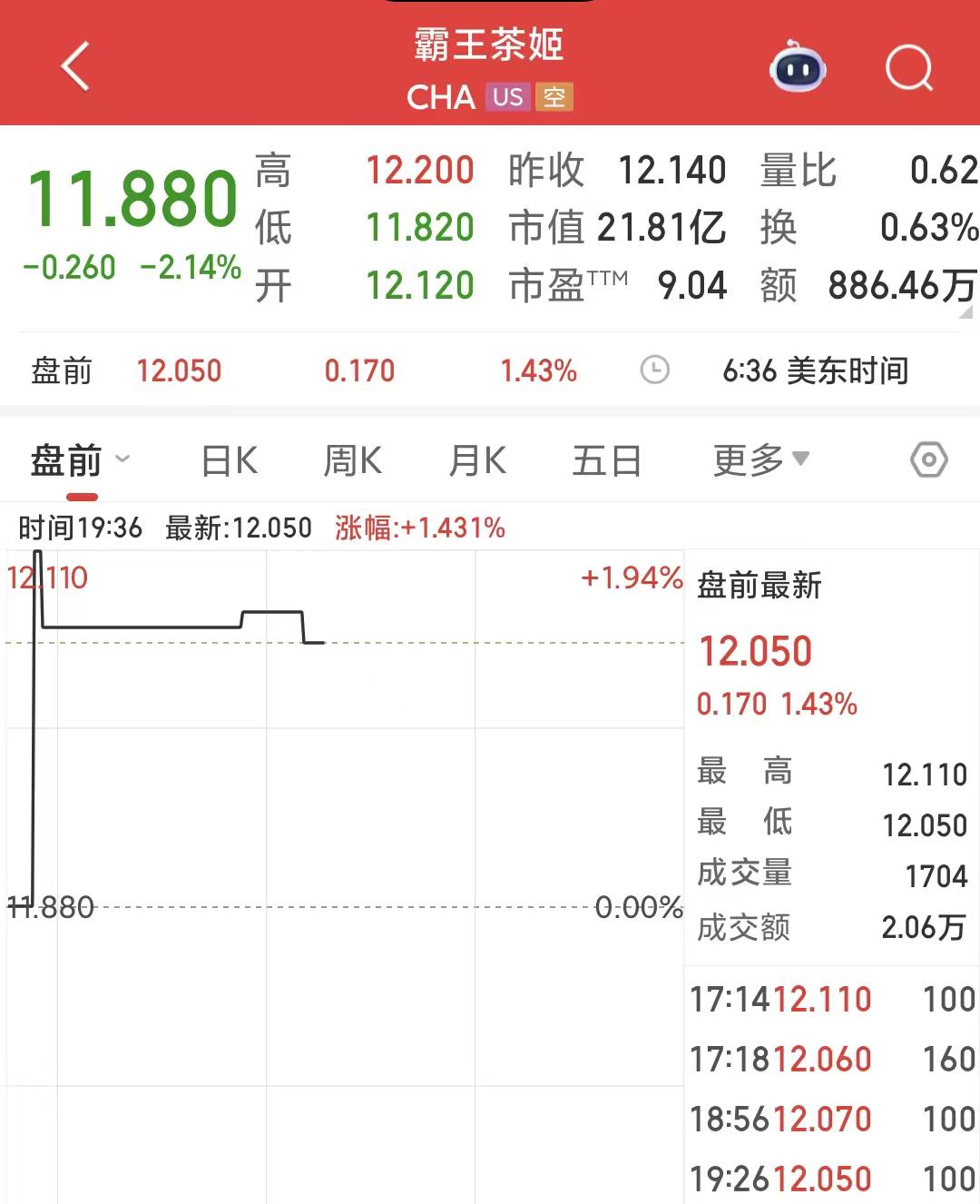 据同花顺显示,1月14日美股收盘时霸王茶姬美股下跌2.14%报11.88美元/股,市值为21.8亿美元。截至发稿,盘前涨幅1.43%,报12.05美元/股。