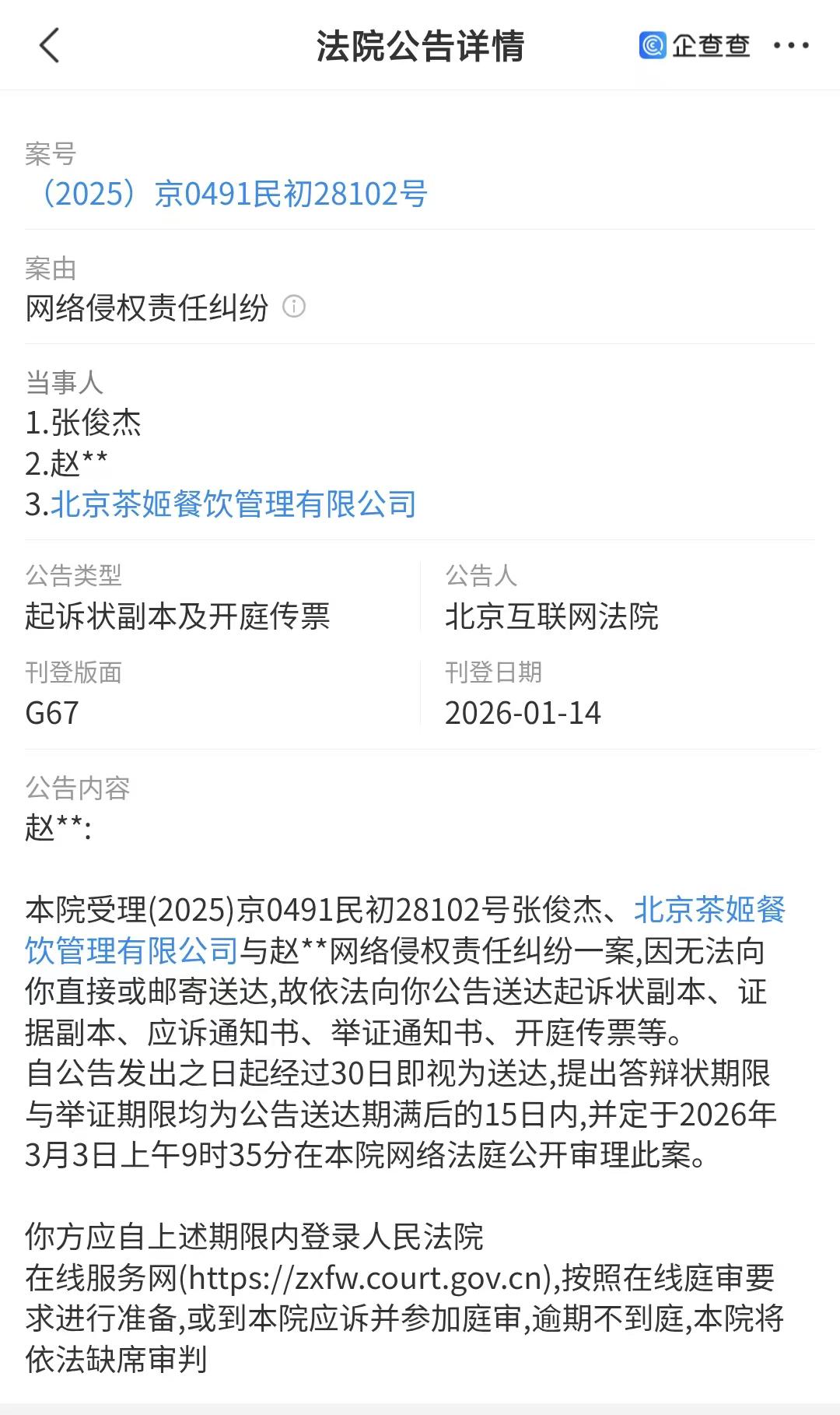 据公告显示,因无法直接或邮寄送达消息,故依法公告送达起诉状副本、证据副本、应诉通知书、举证通知书、开庭传票等。自公告发出之日起经过30日即视为送达,提出答辩状期限与举证期限均为公告送达期满后的15日内,并定于2026年3月3日上午9时35分在本院网络法庭公开审理此案。
