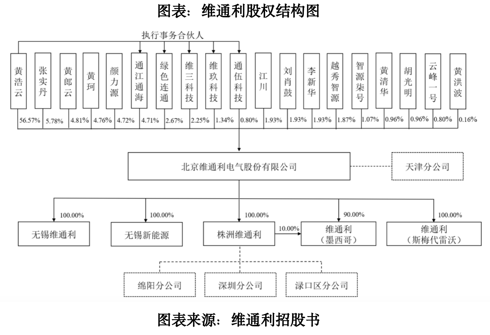 截至招股书签署日(2025年12月30日),黄浩云直接持有维通利56.57%的股权,是该公司的控股股东及实控人。另外,其弟黄郎云、其妻颜力源、其女黄珂等多人及多个员工持股平台为其一致行动人,合计持有该公司85.51%的股权。