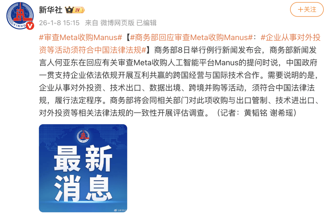 紧接着,中国商务部于2026年1月8日在例行新闻发布会上回应此事,表示将联合相关部门就此次收购是否符合出口管制、技术进出口、对外投资等法律法规开展评估调查。