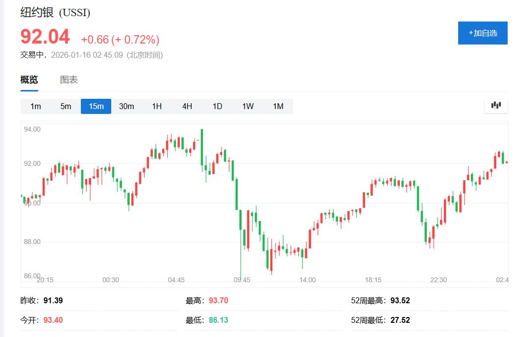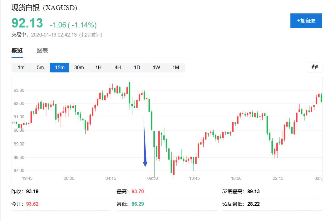 现货白银周四在亚市盘初涨至93.75美元上方,连续第四日创盘中历史新高,亚市早盘即转跌并保持跌势,亚市盘中刷新日低时跌至86.40美元下方,日内跌近7.3%,美股午盘跌幅收窄至2%以内。