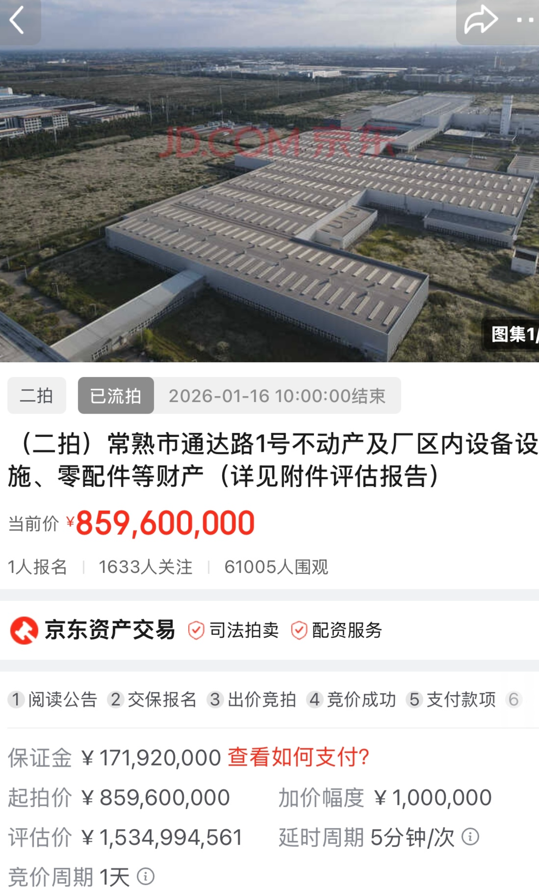 观致汽车常熟工厂第一次拍卖于2025年12月底进行,当时起拍价约10.75亿元,最终流拍,第二次拍卖起拍价相较第一次已经打了八折。
