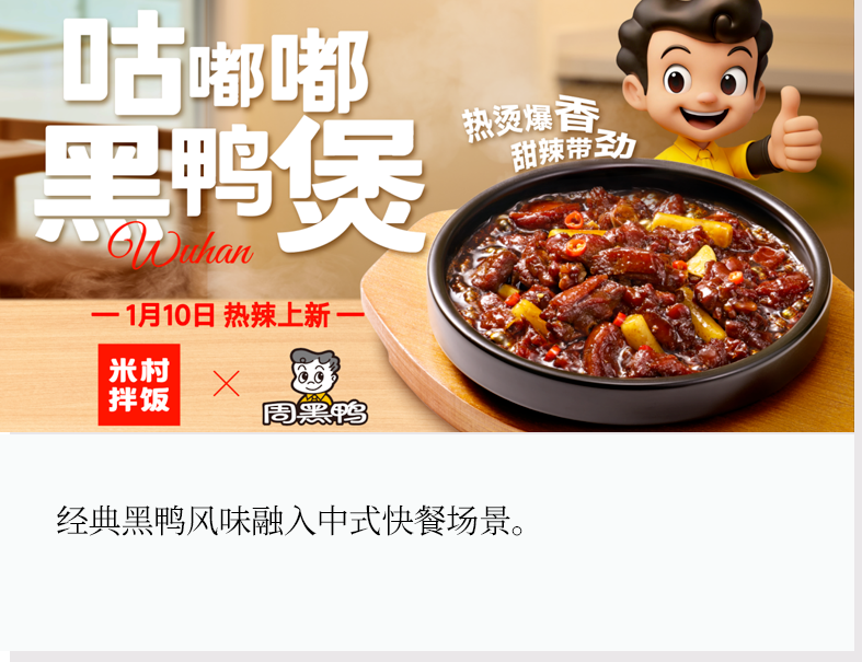 1月10日,周黑鸭和米村拌饭联名,推出新品“咕嘟嘟黑鸭煲”。当冒着热气的鸭腿肉在煲仔中滋滋冒泡,周黑鸭的甜辣风味弥漫飘香,浓油赤酱的香气甚至“直扑上脸”,软烂入味的鸭肉一抿就脱骨,配上饱满软糯的年糕,再拌进热乎乎的米饭,分分钟让打工人好吃到尖叫。