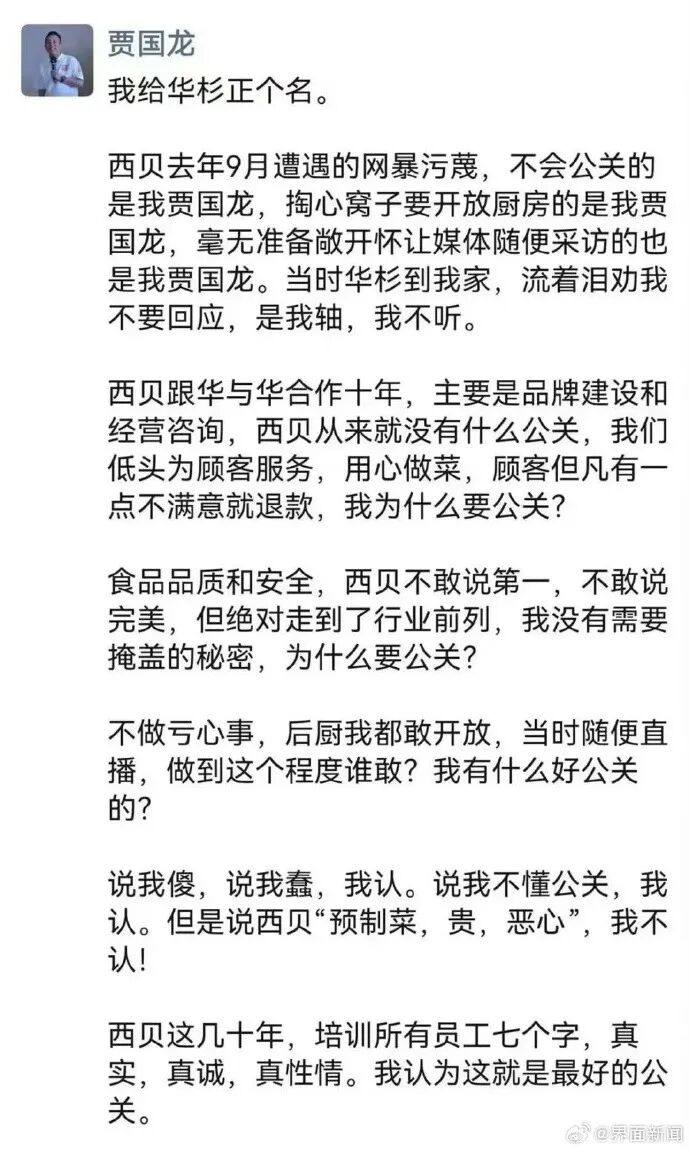 在长文中,贾国龙透露,“西贝跟华与华合作十年,主要是品牌建设和经营咨询,”“西贝从来就没有什么公关,我们低头为顾客服务,用心做菜,顾客但凡有一点不满意就退款,我为什么要公关? ”