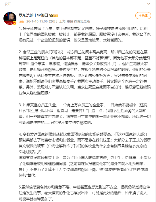 “没有见过一个企业没犯别的错误,仅仅是因为被黑,就能倒闭的。”2026年1月16日,罗永浩发布长文回应西贝餐饮创始人贾国龙近日关于门店关闭的言论,就双方此前的预制菜争议及西贝关店事件作出最新表态。这场始于2025年9月的舆论风波,因西贝宣布关闭102家门店、公关副总裁宋宣的离职再次引发关注。