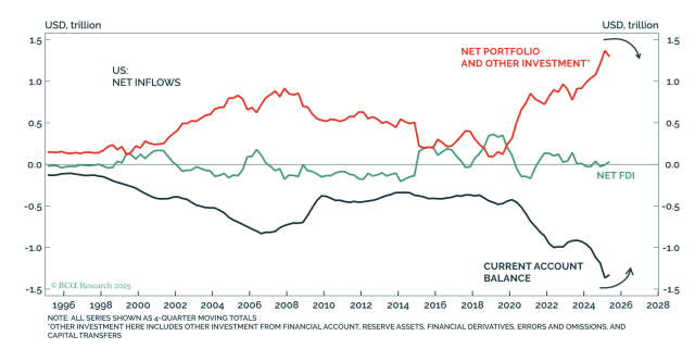 布达吉安:我认为是后者。美国目前面临约1.4万亿美元的经常项目赤字,这完全依赖于证券投资流入(Portfolio Inflows)来支撑,即外国人购买美国的股票和债券。仅在过去一年中,外国投资者净买入美国股票的金额就达到了创纪录的0.7万亿美元,这是史上最大的规模。债券市场的情况也类似,过去12个月约有0.7万亿美元资金流入。