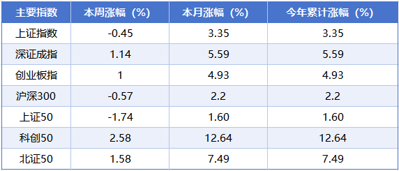 指数层面,本周A股主要指数呈现涨跌分化的态势。其中,科创50表现较为抢眼,累计上涨2.58%;北证50和深证成指紧随其后,累计涨幅分别为1.58%和1.14%。反观权重类指数,上证50、沪深300、上证指数均小幅收跌,跌幅依次为1.74%、0.57%、0.45%。
