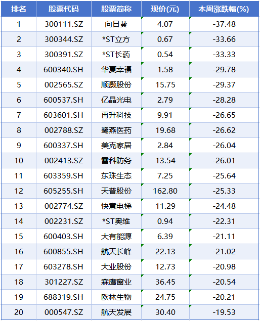 本周个股跌幅榜前五位分别是向日葵、*ST立方、*ST长药、华夏幸福、顺灏股份,累计跌幅分别为37.48%、33.66%、33.33%、29.78%、29.37%。