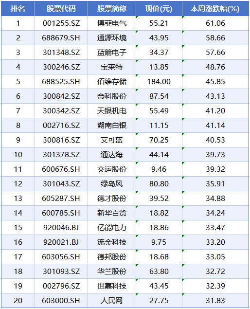 个股方面,本周个股涨幅榜前五位分别是博菲电气、通源环境、蓝箭电子、宝莱特、佰维存储,累计涨幅分别为61.06%、58.66%、57.66%、48.76%、45.85%。