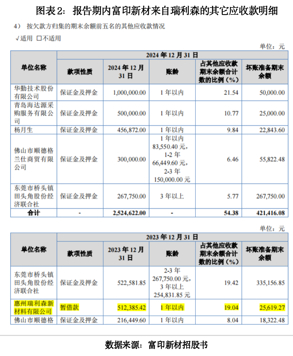 然而,招股书和第一、二轮审核问询回复文件显示,富印新材并未披露与瑞利森、东莞钜信的相关合作信息。招股书中仅显示,截至2023年末,富印新材来自瑞利森的其它应收款为51.24万元,该应收款的款项性质为“暂借款”。