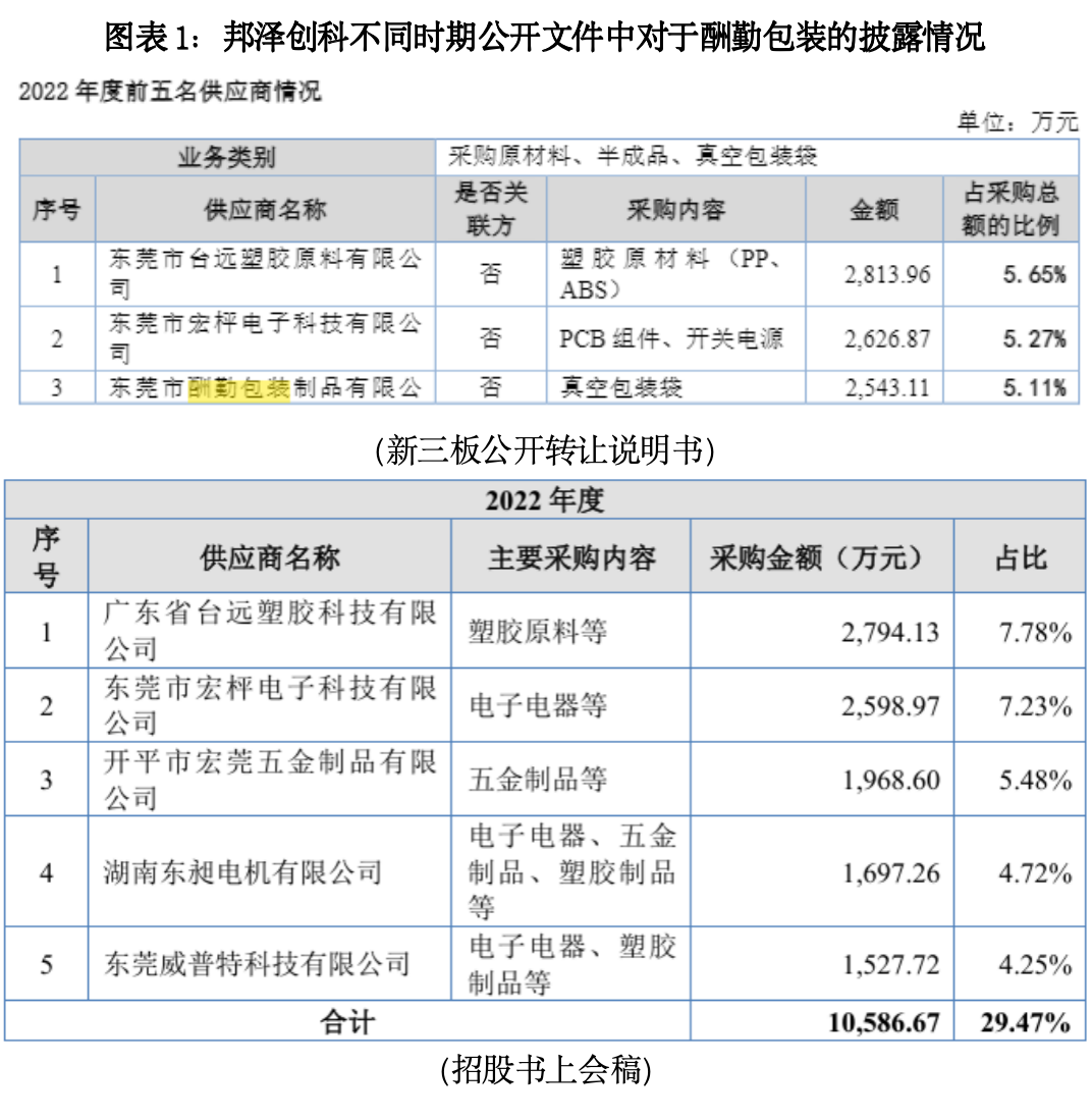 但在最新披露的北交所招股书(上会稿)中,邦泽创科2022年和整个报告期内前五大供应商名单中,并未出现酬勤包装的身影,核心供应商就这样消失得无影无踪。
