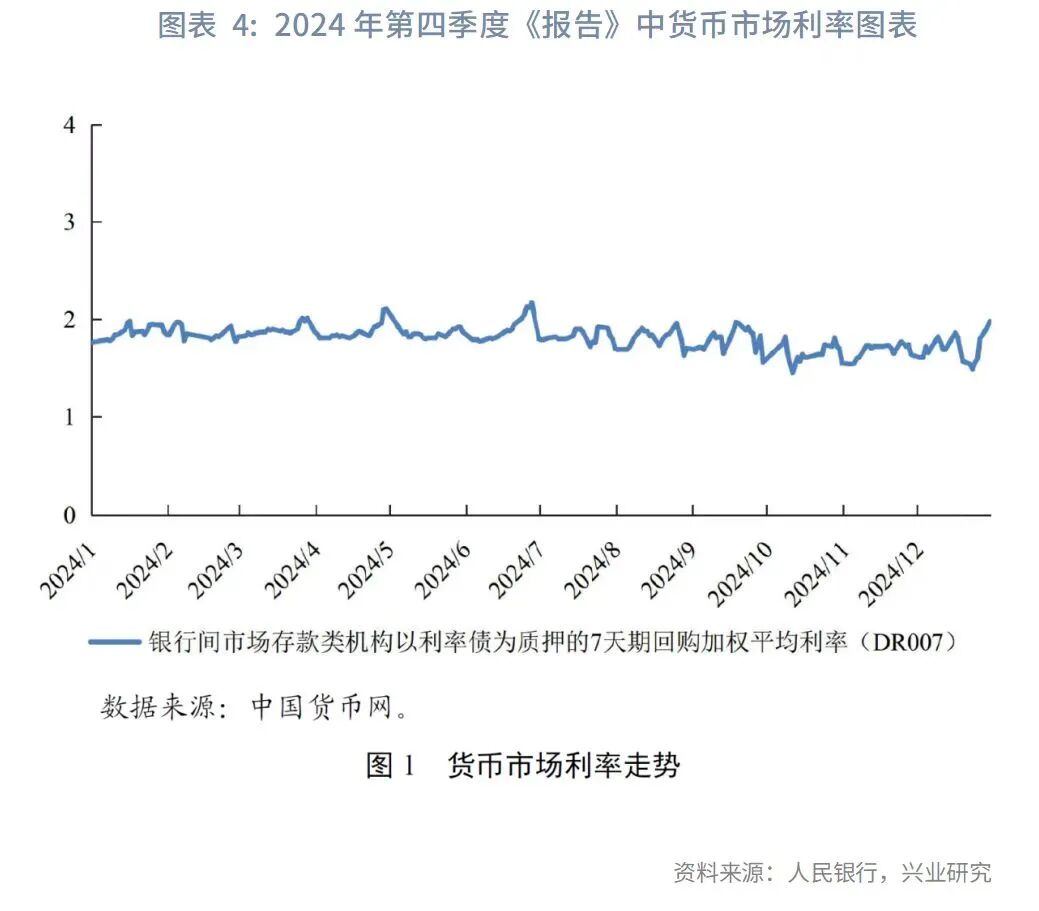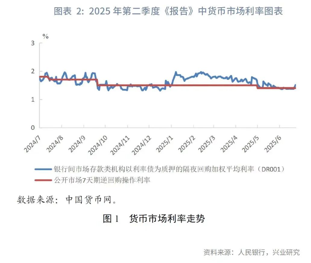 记者注:2024年四季度报告以DR007作为货币市场利率代表,2025年二季度报告以DR001作为货币市场利率代表,并与政策利率OMO作比较