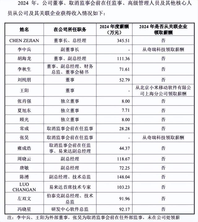 其中,实控人陈泽坚作为澳籍华人,2024年薪酬达345.51万元,位居高管薪酬首位;副总经理、技术总监薪酬148.04万元,副总经理周晓云薪酬118.67万元,董事、副总经理胡海龙薪酬111.36万元,易来达首席技术专家薪酬103.23万元,仅这五位高管的薪酬合计就达826.8万元,占2024年高管薪酬总额的63.4%。