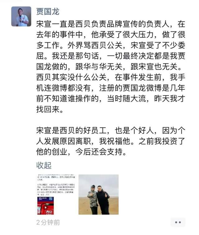贾国龙给予了宋宣很高的评价,他在朋友圈发文表示:宋宣一直是西贝负责品牌宣传的负责人,在去年的事件中,他承受了很大压力,做了很多工作。外界骂西贝公关,宋宣受了不少委屈。我还是那句话,一切最终决定都是我贾国龙做的,跟华与华无关,跟宋宣也无关。西贝其实没什么公关,在事件发生前,我手机连微博都没有,注册的贾国龙微博是几年前不知道谁操作的,当时随大流,昨天我才找回来。宋宣是西贝的好员工,也是个好人,因为个人发展原因离职,我祝福他。之前我投资了他的创业,今后还会支持。