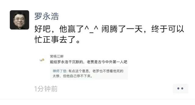 “能给罗永浩干沉默的,老贾是古今中外第一人吧”。罗永浩在宣告贾国龙赢了的朋友圈中,转发了这样一个截图,下面还有人附和:“有点这个意思,老罗也不想看他死得太惨,但他自己停不下来。”