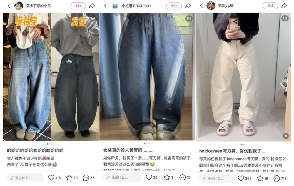 甚至在社交媒体上,也诞生了大量“翻车现场”,最多的是某些白牌弯刀裤型被形容成“超绝罗圈腿”,像两个大括号。所有这些好笑荒诞又真实的案例都指向一个事实:裤子变重要不是因为消费升级,而是因为人开始认识并尊重自己的身体感受,这是需求端发生质变的信号。