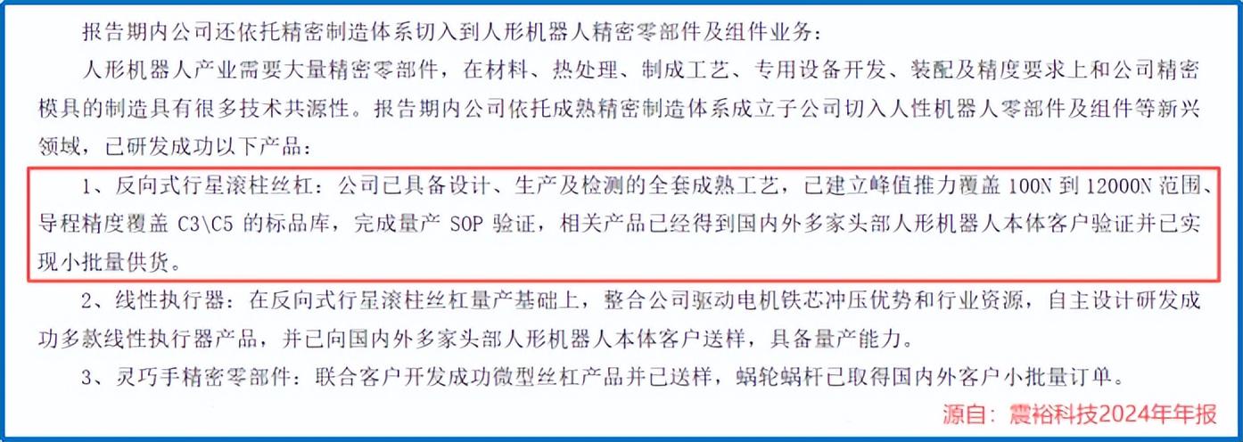 2024年,公司就完成了行星滚柱丝杠的量产SOP验证,相关产品已通过下游多个客户的验证,并实现小规模供货,迈出商业化落地的关键一步。