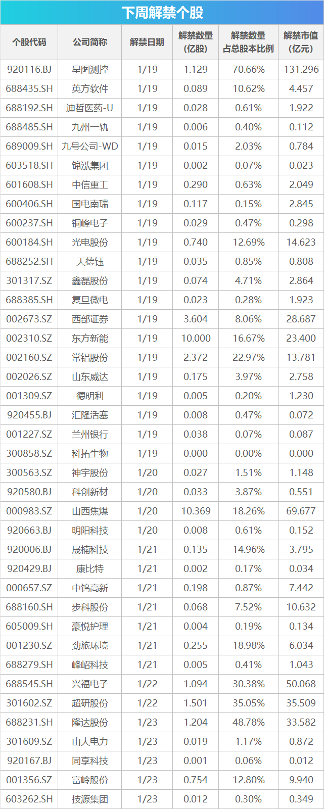 Wind数据显示,下周(1月19日-1月25日)共有39家公司限售股陆续解禁,合计解禁34.47亿股,按最新收盘价计算,合计解禁市值为464.99亿元。