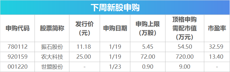 下周将有3只新股发行,分别为沪市主板振石股份、北交所农大科技和深市主板世盟股份。