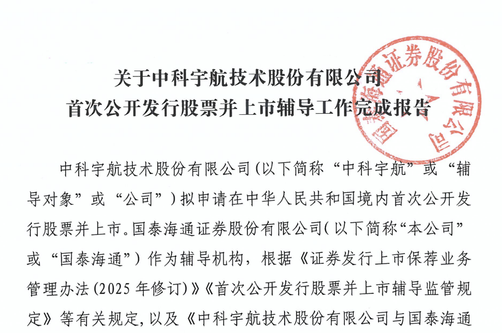 国泰海通发布中科宇航上市辅导工作完成报告。