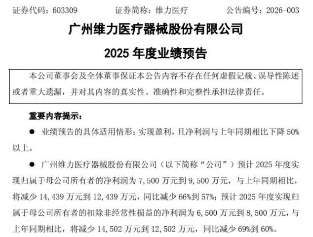 1月8日,广州维力医疗器械股份有限公司发布2025年度业绩预告,预计归母净利润同比大幅下滑57%到66%。