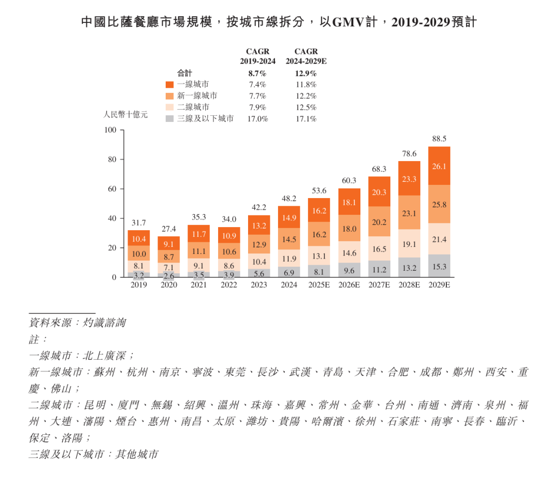 同样据灼识咨询数据,中国披萨餐厅市场规模于2019年的317亿元增长至2024年的482 亿元,预计2024年至2029年的复合年增长率达12.9%,于2029年达到人民币885亿元。